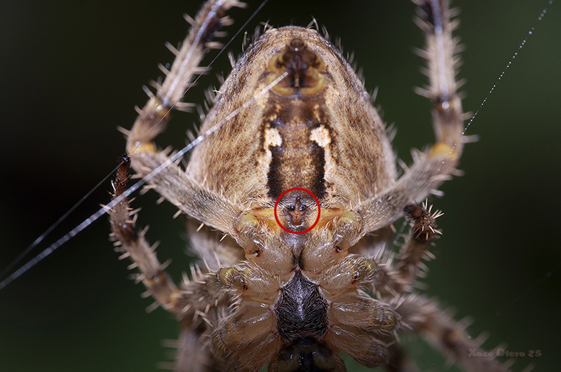 Na segunda imaxe, vista ventral dunha femia adulta. O único xeito fiable de diferenciar visualmente esta especie da moi similar Araneus pallidus é a lonxitude do escapo do epixino (sinalado cun círculo vermello), máis prominente e estreito en A. diadematus.