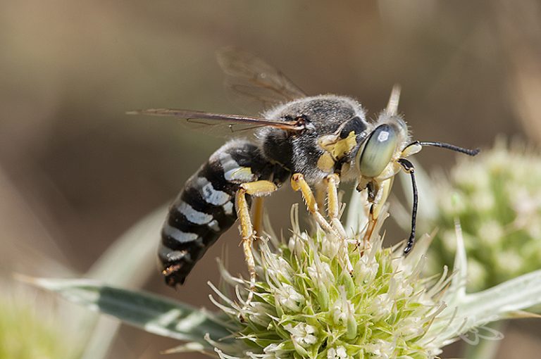 Phylum ARTHROPODA/Subphylum HEXAPODA/Clase Insecta/Orde Hymenoptera/Suborden APOCRITA/Sección ACULEATA/Superfamilia APOIDEA/»SPHECIFORMES»/Familia CRABRONIDAE/Subfamilia Bembicinae/Tribu Bembicini/Xénero Bembix Fabricius, 1775/ Estou enfocando unha mosca grande, aparece coma un raio a Bembix abalanzándose sobre ela, levántase, encárase comigo e vaise pitando. En Guitiriz 0 02/08/2014.