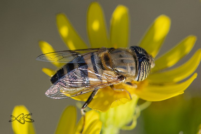 Suborde Brachycera/ Cyclorrhapha/ Syrphidae/ Eristalinae indet./ Eristalinus spec. Ademáis das tre especies presentadas en Galicia voa unha outra especie: Eristalinus sepulchralis (Linnaeus, 1758) bastante parecida con E. aeneus (Scopoli, 1763). Son as catro especies presentes en territorio europeo. Eristalinus aeneus (Scopoli, 1763) Ambiente preferido: perto da auga doce. Voa moi rápido e baixo, sobre a…