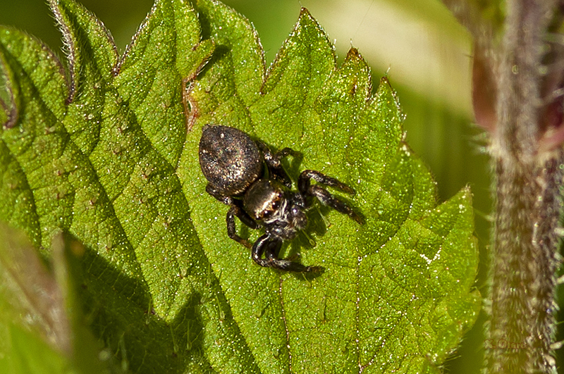 Macho 5,1-6,3 mm e femia 7 mm. De cor moi escuro, moitas veces negro, nunha vista frontal destacan, ademais dese grande par de ollos centrais, unhas liñas brancas por debaixo dos mesmos e ao lados.