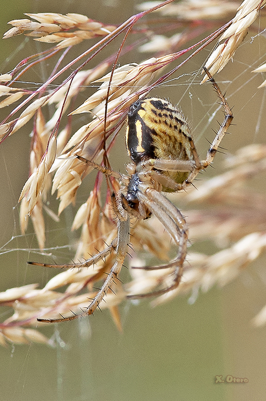 Presente nas catro provincias galegas. Pódese atopar tanto en hábitats áridos coma húmidos normalmente en vexetación de baixa altura, sexan herbas ou arbustos, onde constrúe a súa arañeira.