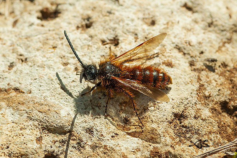 O insecto polinizador é unha avespa, a Dasyscolia ciliata. Estaba convencido de ter unha fotografía dela pero non fun quén de atopala, ou está entre os ficheiros perdidos ou é unha ilusión da miña parte (10/2025: Por fin apareceu. Condeixa-a-Nova, ao suroeste de Coimbra, o 04/04/2010).