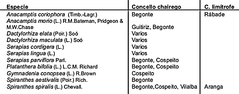 Da nosa listaxe chairega, hai especies de moi escasa aparición – 1 ou 2 poboacións por nós coñecidas na comarca ou moi preto dos límites administrativos – e sen, ou con moi contadas, citas bibliográficas recentes (subliñar que non se fixo unha busca exhaustiva). Casos de Anacamptis morio, Gymnadenia conopsea ou Orchis coriophora; doutras como Platanthera bifolia ou Spiranthes aestivalis tampouco temos moitas referencias e en todo caso nós non as temos fotografado máis que en dúas ou tres localizacións chairegas.
