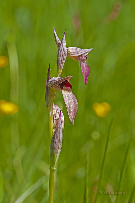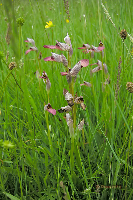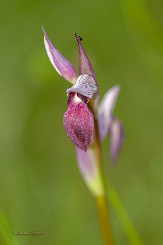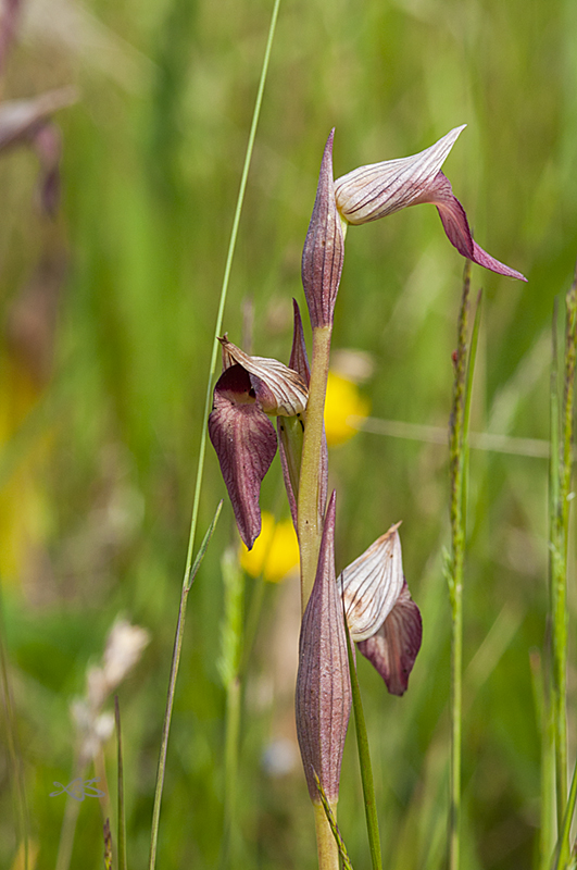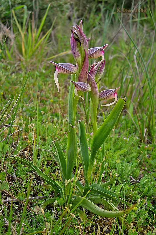 (8)10-35(55) cm; talo verde, ás veces tinguido de vermello na base; follas linear-lanceoladas; inflorescencia rara, con 2-6(8) flores de tons púrpura-grisáceos con nervaduras máis escuras, o labelo de avermellado a castaño, ás veces esbrancuxado, só lixeiramente piloso na base; unha calosidade escura e brillante na garganta é fácilmente distinguible a simple vista.