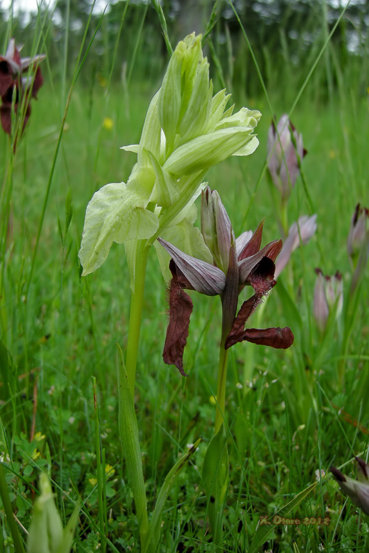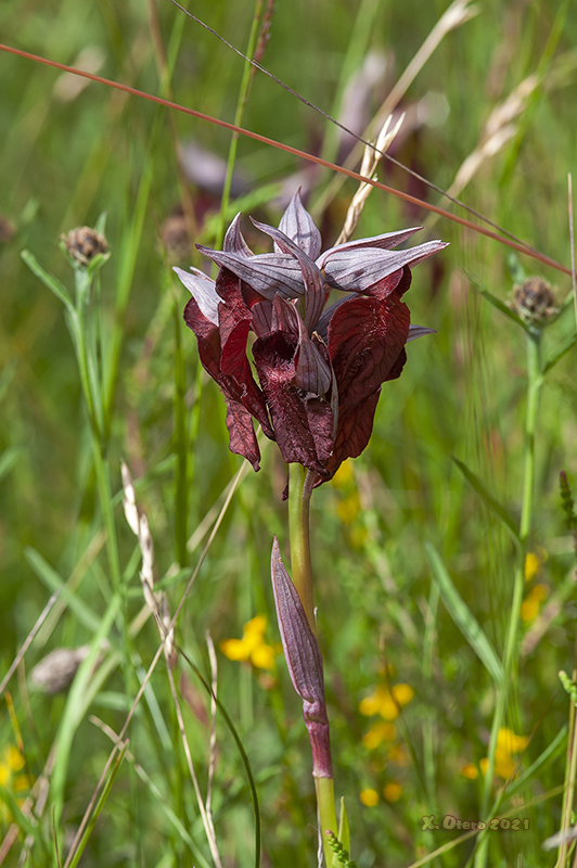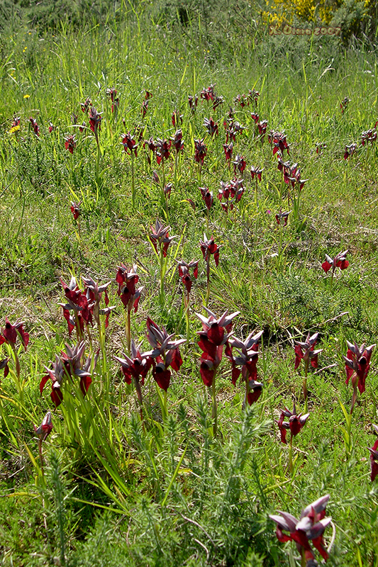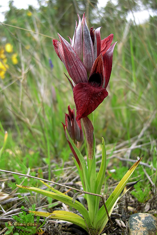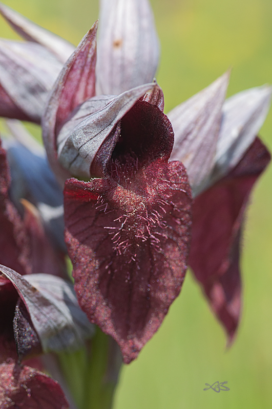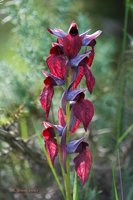 12-40(50) cm; follas linear-lanceoladas, as caulinares progresivamente de menor tamaño; inflorescencia densa con (2)3-10(12) flores agrupadas ao final do talo, de cor ± púrpura, labelo escuro con abundante pilosidade cara á base onde hai dúas calosidades lixeiramente diverxentes de cor púrpura escuro, case negras, brillantes e con pilosidade branca; carecen de esporón.