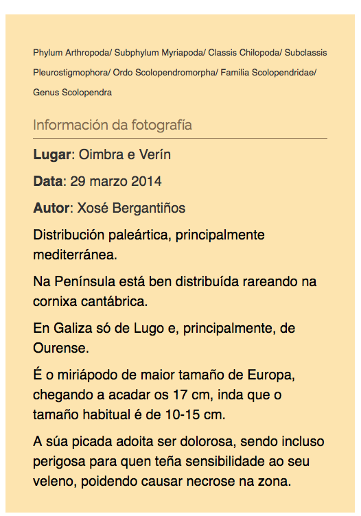 Scolopendra cf. cingulata Latreille, 1789 Phylum Arthropoda/ Subphylum Myriapoda/ Classis Chilopoda/ Subclassis Pleurostigmophora/ Ordo Scolopendromorpha/ Familia Scolopendridae/ Genus Scolopendra Oimbra, 27/07/2011 Oimbra, 27/07/2011 Oimbra, 27/07/2011 Verín, 21/04/2012 Verín, 21/04/2012