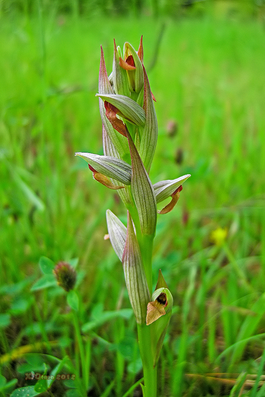 (10)15-28(40) de altura total. O talo, verde, pode presentar tintes avermelladas na parte inferior; con 4-8 follas linear-lanceoladas; a diferenza que primeiro salta á vista coas outras dúas Serapias e o pequeno tamaño da parte visible do seu labelo, que ademais está dirixido cara abaixo e frecuentemente cara atrás. A inflorescencia no seu conxunto é ± densa de tonalidades de gris avermellado a avermellado verdoso, o labelo de vermello escuro a vermello amarelento, con tonalidades verdosas, ten 2 pequenas calosidades practicamente paralelas na súa base.