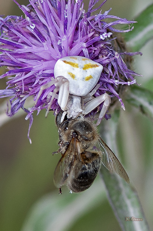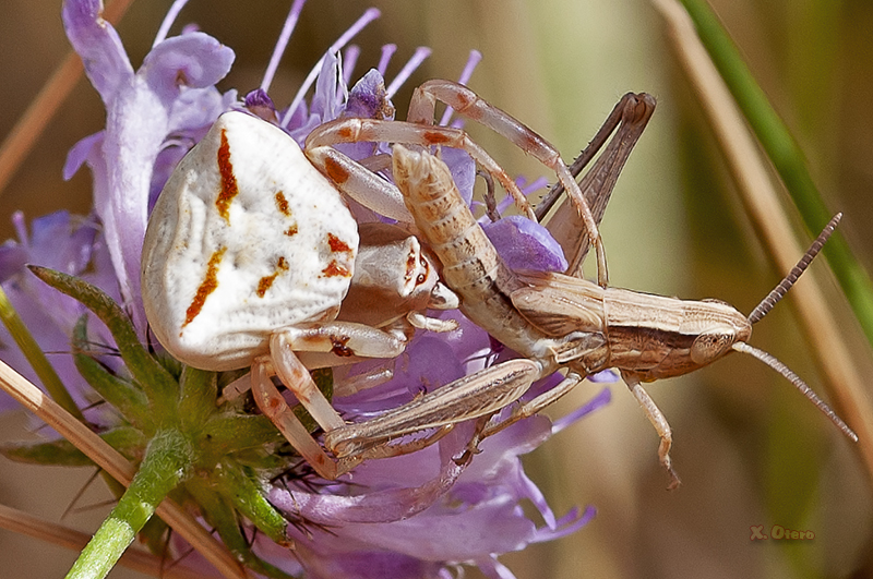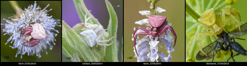 Poden cambiar de cor para adaptarse ao entorno. Vive sobre flores e vexetación próxima. As femias adoitan ser de cores máis esbrancuxadas, rosáceas ou amareladas que os machos, de tons frecuentemente algo máis escuros.